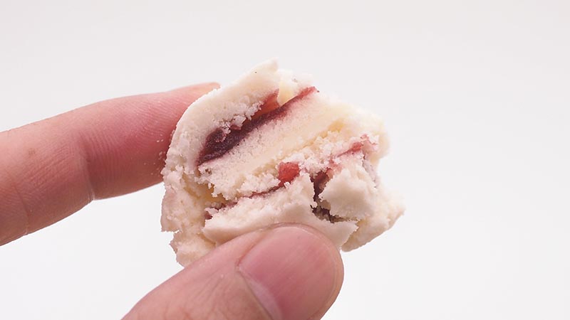 Broke it in half, I can see the cookie layered in two inside and it makes a round shape. Rasberry sauce fully filled in the both layered parts.