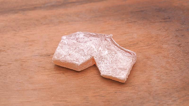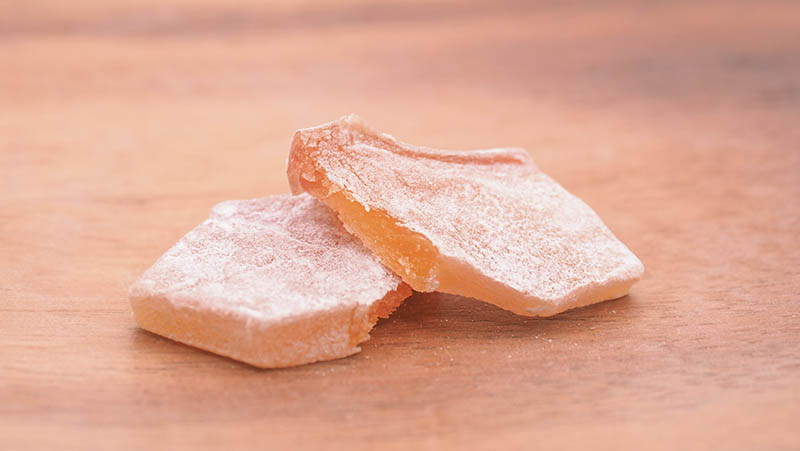It is like dried fruit cut into bite-size pieces. Okinaya sticks to use the “Kougyoku apples” because it gives stronger acidic variety other than other races.