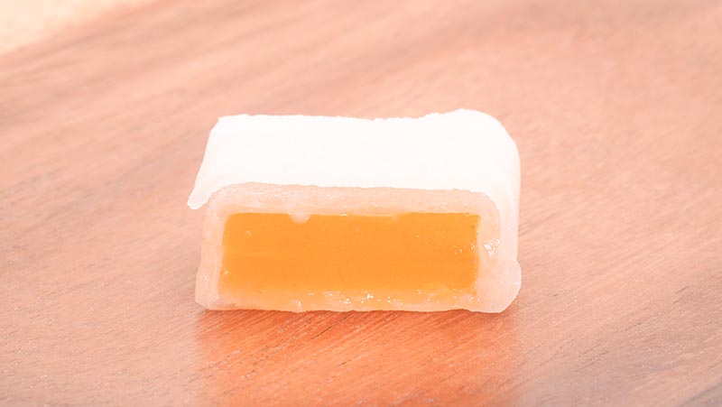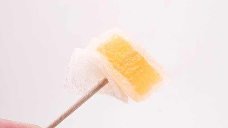 Looking at the cross section, the plum agar is much thicker than noshi-ume. The contrast between the golden plum jelly and the pure white gyuhi is beautiful.