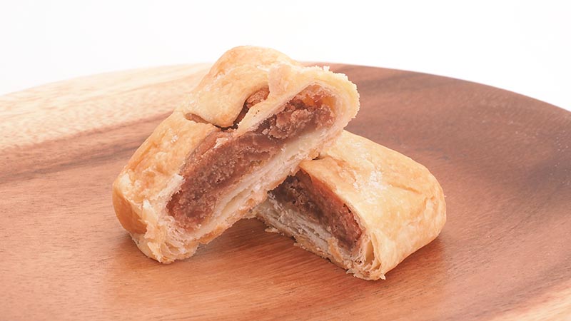 The reddish-brown red bean paste is contained in the layers of pie crust. Walnuts seem to be mixed in the paste, which looks delicious.