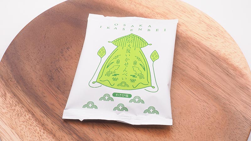 Osaka Ika senbei, squid rice crackers packed in a unique package attractsand draw our attention at souvenir shops in Shin-Osaka Station and other areas. This is a rice cracker with a unique flavor called wasabi salt.