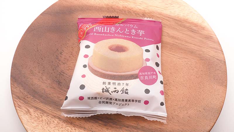 There are five kinds of baumkuchen, including yuzu (yuzu), Nichinichi salt caramel, Nishiyama kintoki sweet potato, Yamakita mandarin orange, and strawberry. This time I bought the Nishiyama kintoki sweet potato. This baumkuchen is made from “Nishiyama Kintoki,” a brand-name sweet potato from the Nishiyama plateau in Muroto City, Kochi Prefecture.