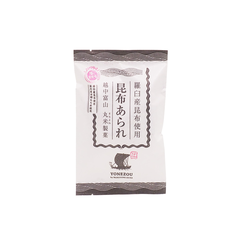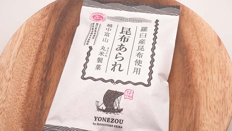 ‘Kombu Arare’, is a rice crackers made by Maruyone Seika, a long-established rice cracker confectionary founded in 1927 (Showa 2) in Nanto City, Toyama Prefecture. I had their ‘Shiroebi Arare’ before; they’re a manufacturer dedicated to making rice crackers used ingredients unique to Toyama.