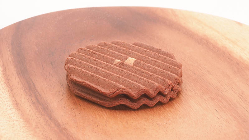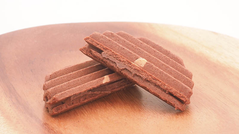 The wavy waffle dough has a cookie-like texture and chocolate cream is sandwiched between them.